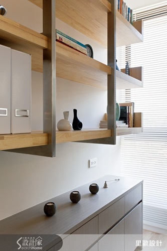 除了採用集成材與木皮材質,設計師特別在書房書櫃採用特殊的鐵件材質,更能展現北歐現代風格簡潔乾淨的調性。