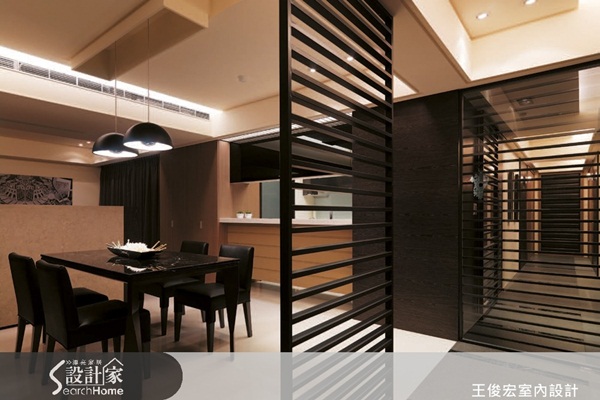 長條形空間內,餐廳、臥房與客廳以一條走道相互連通,而正對玄關的餐廳,採水平格柵屏蔽;銜接臥房的走道部分,則以同樣造型的玻璃格柵門區隔,在需要隱私時可將門片拉上,視覺上仍具有半穿透效果。